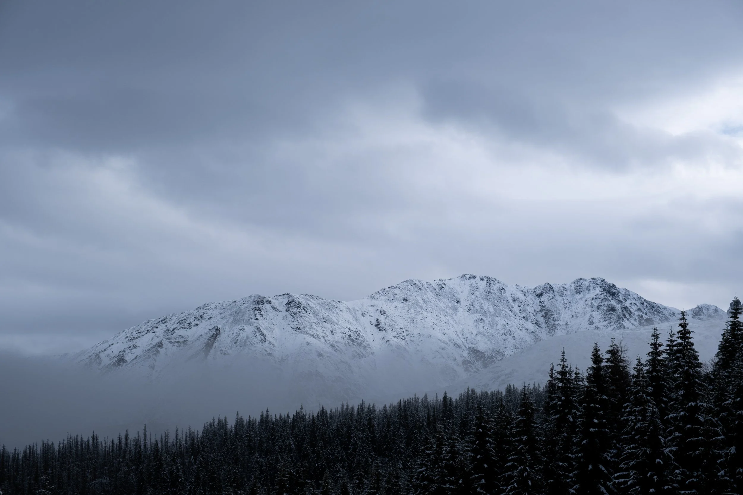 From there, it was only a short walk through the woods until I suddenly popped above the clouds and into winter. I rounded a corner and without warning was in a world of white mountains and snow-capped Christmas trees, as far as the eye could see. The trail became a gentle stroll through this garden of snow, until I came to a high valley dotted with tiny cabins, ringed with an amphitheater of proud peaks. There I rested and stared, until I finally became too cold and retraced my steps to the town below.